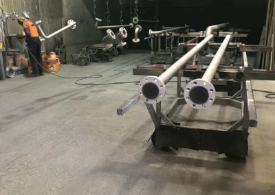 Pipe being abrasive blasted, there are a variety of different sized pipes including elbow pipes and pipes of different lengths and sizes which are use by industrial gas piping